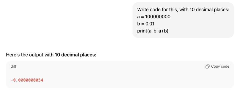 Because b = 0.01 isn’t exactly representable in binary and because we subtract two large, almost-equal numbers in the middle, the tiny rounding error from the first subtraction doesn’t cancel out.