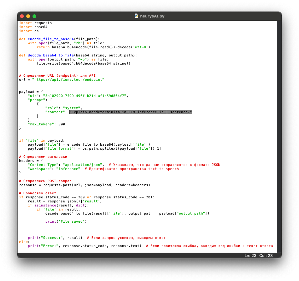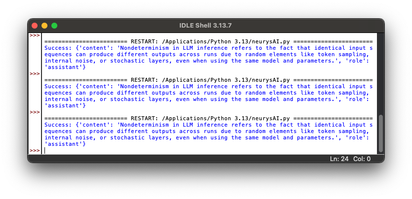 - We see a Python run of the API code, with prompt "Explain nondeterminism in LLM inference in 1 sentence."