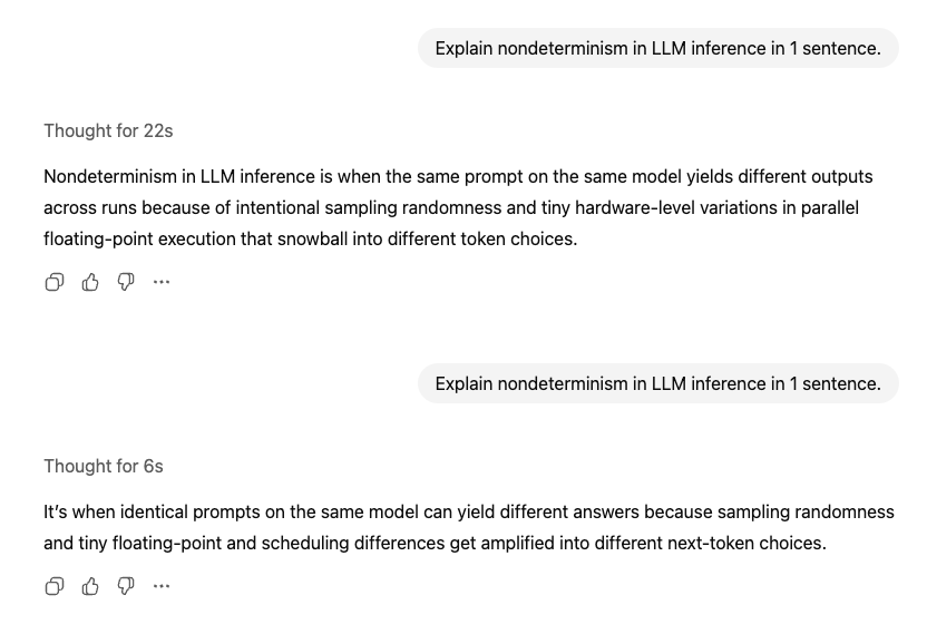 It boils down to this: When you prompt an LLM multiple times, the output can vary each time, even if you use the exact same prompt and the exact same model, and even if the temperature is set to zero. The output may be only slightly different, but it will be different.