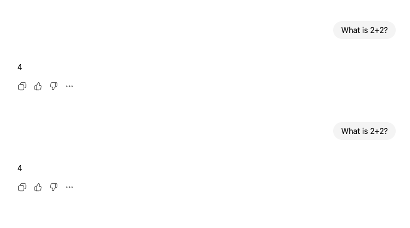 Right! In the case of 2+2, there is only one statistically correct answer, so regardless of the temperature setting, the answer should always be 4. So far so good.